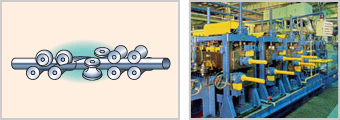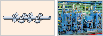 溶接後の管に、ロールを用いて絞りを加え、管の外径寸法を整えます。丸管だけでなく、角管への成形も行います。 |