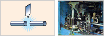 管状に成形された帯鋼の縁部を、高周波誘導電流を利用して加熱溶融圧接を行います。。 |