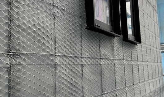 コーナーや開口部周りでの折り曲げ、切断も簡単。施工は通気胴縁にステープルで止め付けるだけ。面倒な役物も不要です。