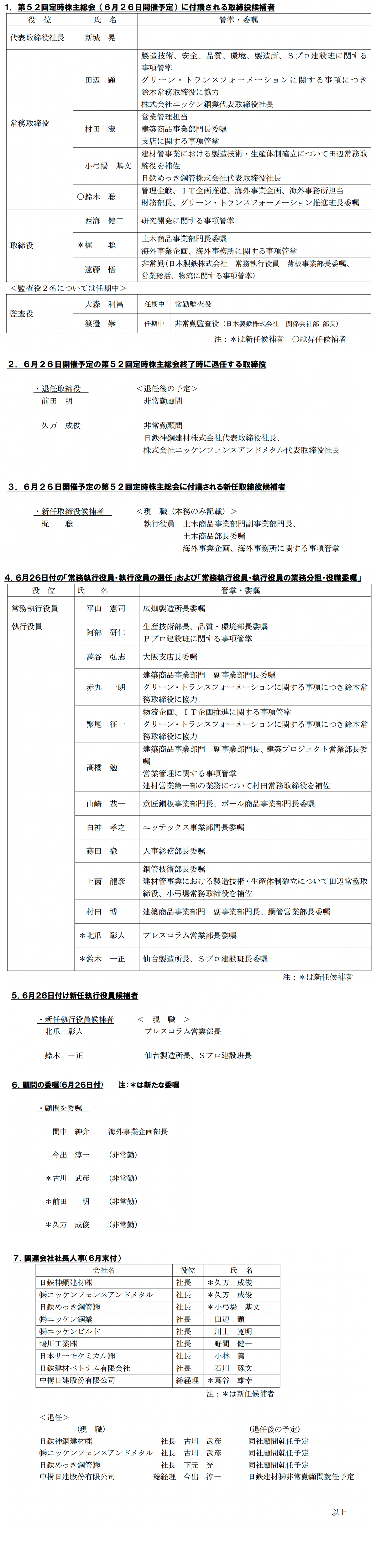本日開催の取締役会において、第52回定時株主総会(2025年6月26日開催予定)に付議される「取締役候補者」ならびに同株主総会終了後開催の第545回取締役会にて正式決定される「代表取締役の選任」、「役付取締役の選任」および「取締役の管掌・委嘱事項」 について内定いたしましたのでお知らせいたします。 また、6月26日付の「常務執行役員・執行役員の選任」および「常務執行役員・執行役員の業務分担・役職委嘱」 についても併せてお知らせいたします。 なお、「顧問の委嘱」、6月末の関連会社社長人事につきましても併せてお知らせいたします。