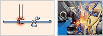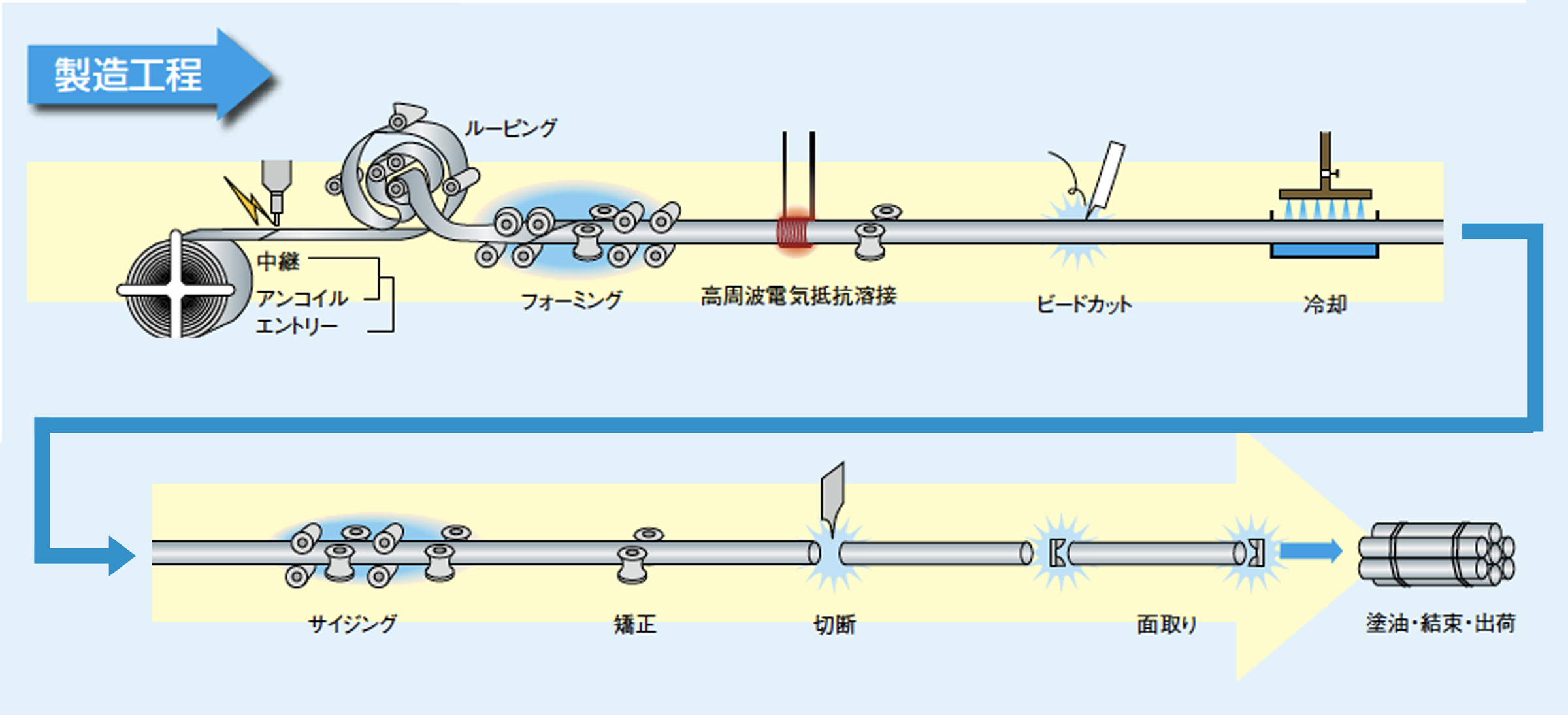 管状に成形された帯鋼の縁部を、高周波誘導電流を利用して加熱溶融圧接を行います。。 |