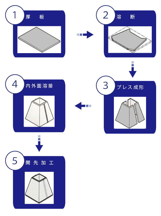 6.外径寸法 200~1400mm、板厚 19~50mm が製造可能で、大径、厚肉、多様な絞り形状に対応しています。