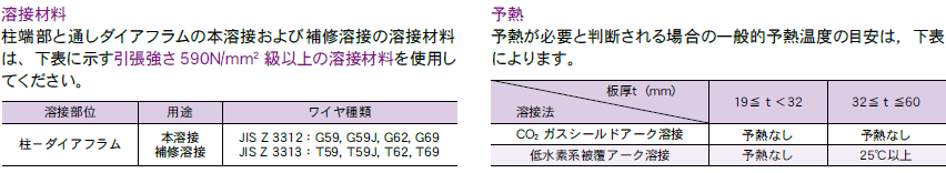 「BCHT385BTF/CTF」に適用する溶接条件と積層法は、(一財)日本建築センターの「冷間成形角形鋼管設計・施工マニュアル」に記載されるBCP325 と同一です。溶接材料及び予熱条件は、下記の溶接材料、予熱によります。(BCJ 評定-ST0232-02)。