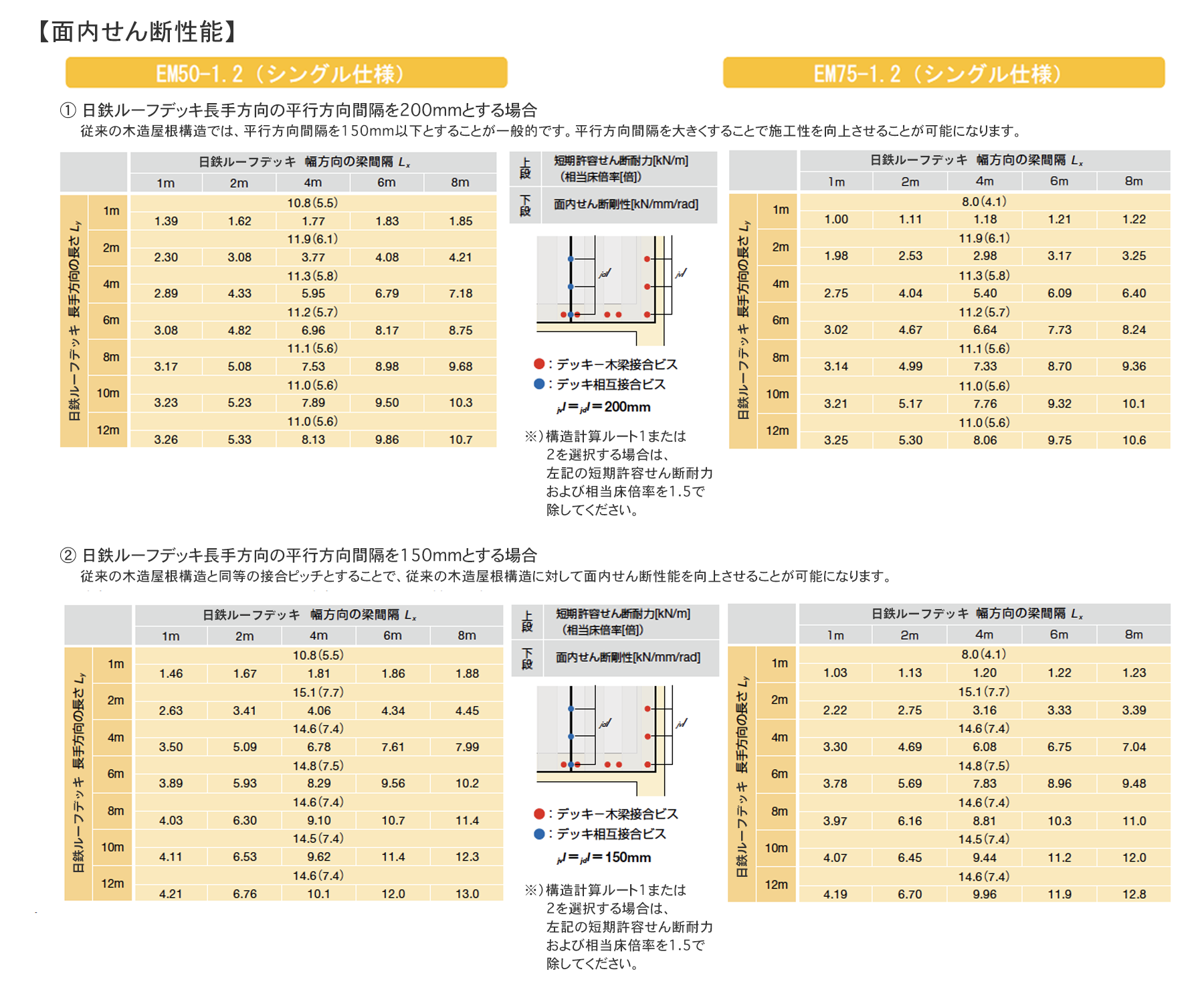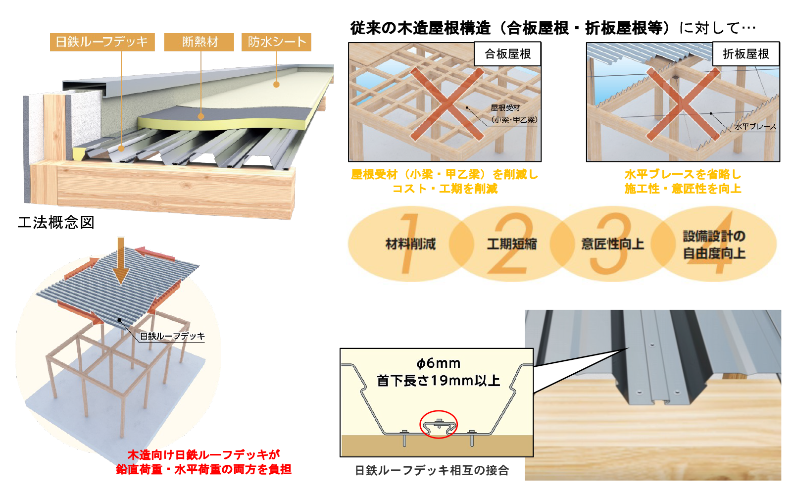 木造向け日鉄ルーフデッキ(EM50・EM75)は、木造建築物の乾式屋根として用い、鉛直荷重や水平荷重に抵抗する工法です。 木造屋根で一般的な合板屋根に対して屋根受材(小梁・甲乙梁)が削減可能でコスト・工期に優れており、高強度な屋根を構築できます。