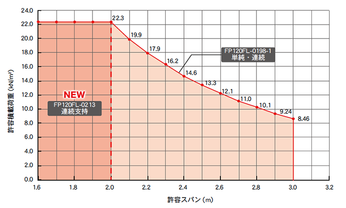 従来の耐火構造に比べ、山上コンクリート厚さが20mm低減され、床自重で約50kg/m2の軽量化となります。