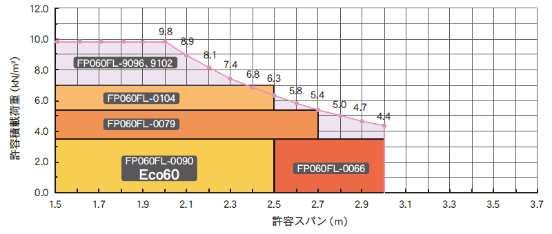Eco60はEZ50を用い、山上コンクリート厚さを60mmとした最軽量の床1時間耐火構造認定です。