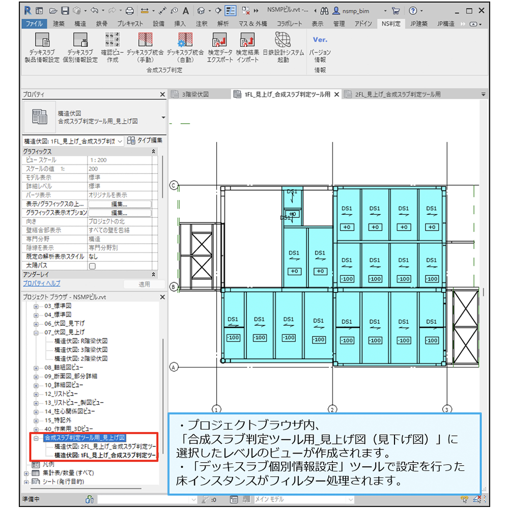 ![]() デッキスラブ構造検討用の確認ビューを自動作成するコマンド 選択したレベルに対応した確認ビューが作成され符号・レベル・スパン方向が自動で配置される |