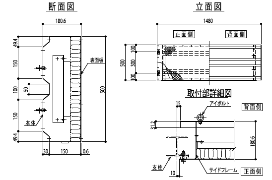 23.2 | 表面板: アルミニウム板 JIS H 4000 A5052P t=0.6mm 本体: フロールボンド(フッ素樹脂フィルムラミネート鋼板) t=1.2mm サイドフレーム: 溶融亜鉛めっき鋼板 JIS G 3302 SGH400-Z27 t=1.6mm 吸音材: ポリエステル繊維吸音材(表層 撥水・難燃処理) t=50mm または グラスウール吸音材 JIS A 6301 GW-B 32K t=50mm ETFEフィルム t=21μm + 撥水ガラスクロス |