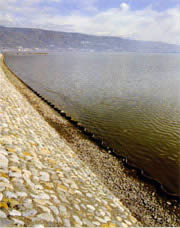 | 小型船舶等が接岸する岸壁で構造形式としてはタイロッド式矢板壁を採用するのが一般的です。 | ![]() 護岸造成にタイロッド式で設置された軽量鋼矢板の施工例 |
