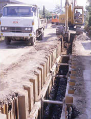 | 管路布設工事、建築基礎工事の土留め工(山留め工)、橋台、橋脚、水門工事などの仮締切工、埋立工事などの仮護岸として使用できます。 | ![]() 下水道管埋設工事で土留めとして活躍中の軽量鋼矢板 |