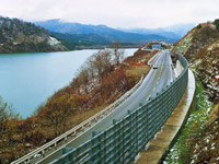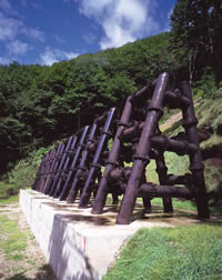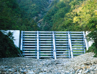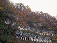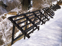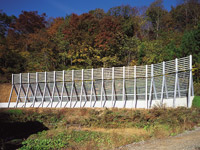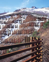 | なだれ防止柵(予防柵)の配置は、図のように、予想される破断線が最上段の柵の背面領域に入るようにし、斜面勾配が30°以下になる位置まで柵を設けます。 また、柵と柵の標準的な水平間隔は、表層なだれを対象とする場合で1~2m程度です。 |