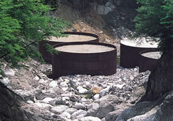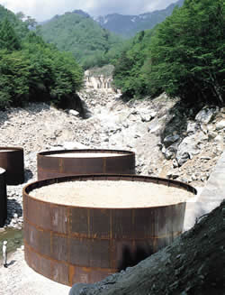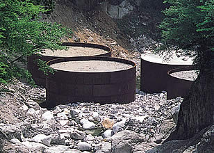 「鋼板セルえん堤」とは、鋼製のセグメントを組み上げた鋼殻と中詰土砂で円筒体のセルを構築する重力式の砂防えん堤です。 セルの配置は自在で、透過型にも不透過型にも対応可能です。 |