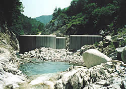 透過型の鋼板セルえん堤は、不透過型と同じ鋼板セルを一体一体独立させ、所定の間隔に配置した重力式のえん堤です。その目的はスリット構造の透過型えん堤と同様ですが、巨礫を捕捉する機構がスリット構造では直接的な閉塞効果によっているのに対して、セルえん堤では堰上げ・堰止め等の水理的な減勢効果によっている点が基本的に異なっています。したがって、開口部の幅は相対的に大きくとれ、機械土工で除石作業を容易に行うことができます。