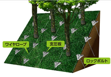 “樹木を保全した斜面安定工法、ノンフレーム工法” 樹木伐採や法切を行わず、現況地山のままで施工するという斬新な発想から誕生したこの工法には、従来の技術にはない様々な特長があります。