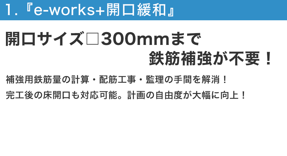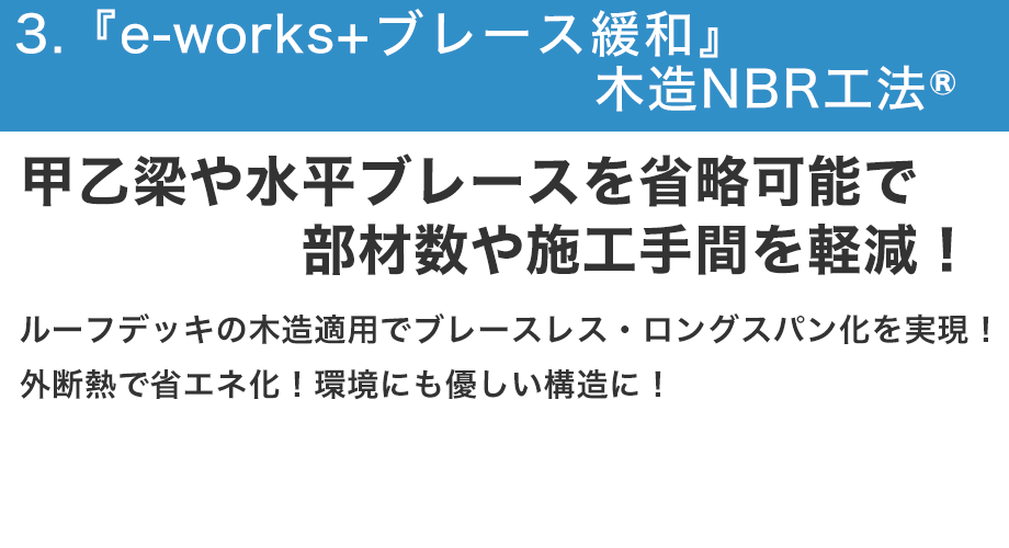 日鉄建材は、建材メーカーの立場から現場施工や設計業務の効率化、手間削減ができる商品・工法の開発を進め、 設計・施工合理化ブランド『e-works+(イーワークスプラス)』を立ち上げました。 『e-works+』とは、日鉄建材の建築商品に関する設計・施工合理化工法の総称であり、 「e」はefficiency(効率性)、economic(経済性)、environmentally(環境性)を表しています。