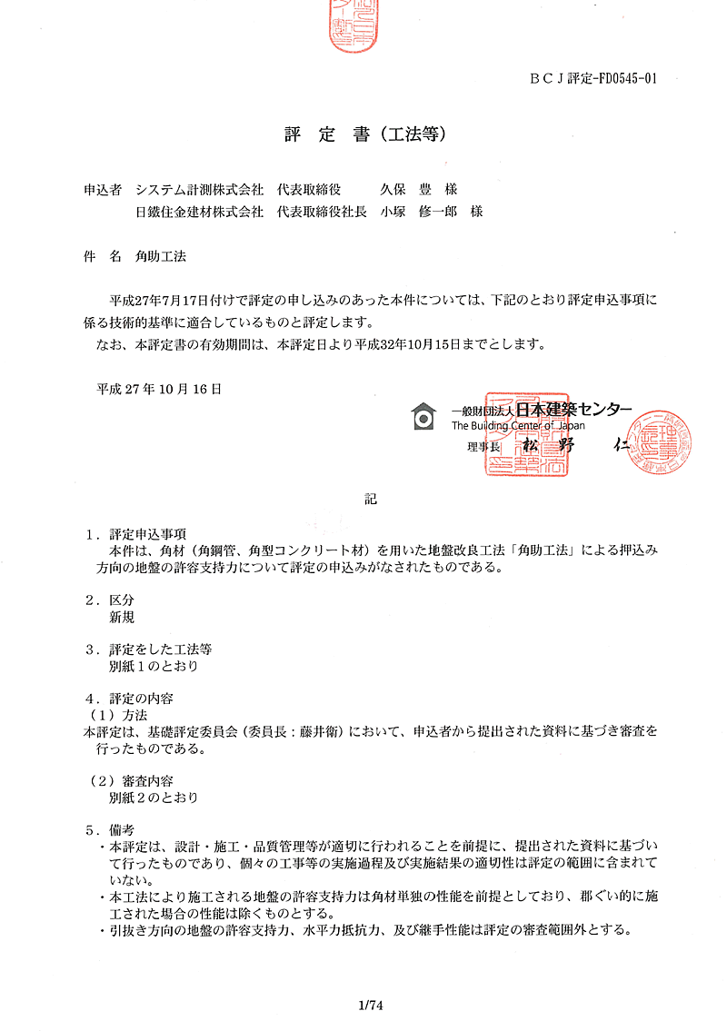 角助工法は、(一財)日本建築センターの評定を取得しています。(BCJ評定-FD0545-01)