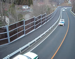 Our double-faced acoustic panels are suitable for locations such as highway median strips where noise sources are adjacent to each other and affect both sides. Panels are configured in a double structure to shut out noise from both sides and provide outstanding sound absorbing effects.