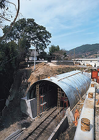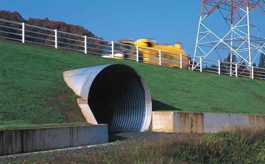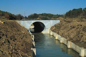 Corrugated pipe is made from thin steel sheet and is very lightweight and easy to handle, with weight just 1/4 to 1/12 that of Hume pipes having the same diameter. Furthermore, because corrugated pipe is flexible and the load can be distributed, the stress is only 1/3 or so compared to that of rigid pipes such as Hume pipes.