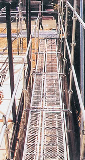 An easily assembled/disassembled support method that also serves as a scaffold to provide safe work platform and walkway.