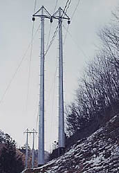 パンザーマストは、高張力鋼板(降伏点390N/mm2以上)を材料とした管状の各構成部材を継ぎ合わせて、1本の柱にする鋼板組立柱です。各部材は2mの長さを持つ直円錐台形で、用途に応じて約28mを最大にして、長短強弱の各種の電柱を組み立てることができます。また、全部の部材には、内外面に溶融亜鉛めっきを施してありますので、長い耐用年数が見込まれます。