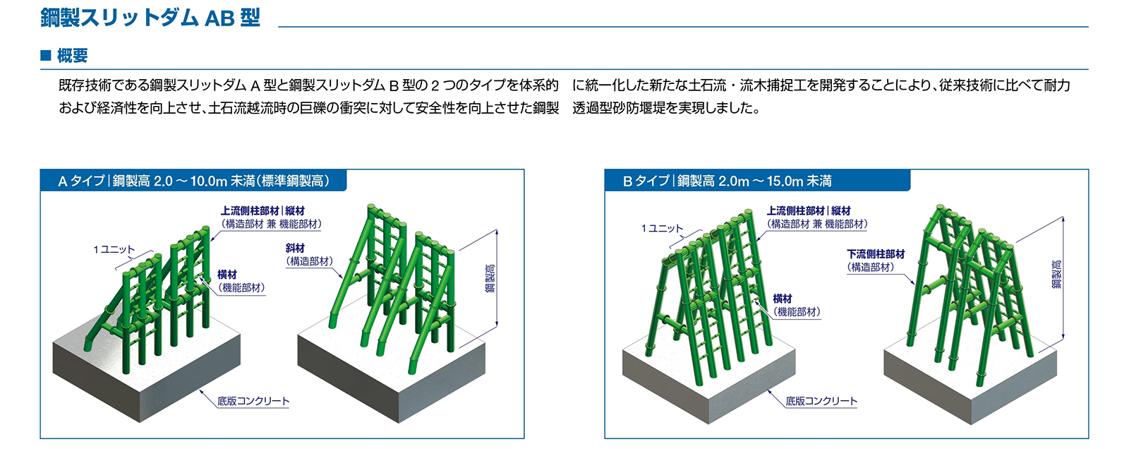 鋼製スリットダムAB型にはAタイプとBタイプがあり、設計条件によって最適な形状をご提案します。