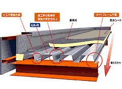 ニッテツルーフデッキは金属下地外断熱防水工法に使用する鋼製屋根下地です。 外断熱工法は省エネルギー効果抜群の断熱性に優れた新工法です。 |
