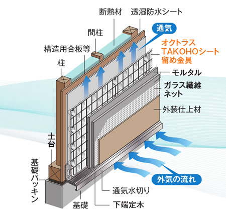 TAKOHOシートで通気層を確保する構造になっており、壁の中を縦横自在に空気が流れます。