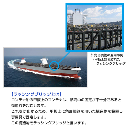 当社は日本海事協会から「製造法の承認」を受けた角形鋼管を製造販売し、一部ユーザーの船体部材に採用されました。