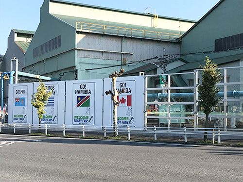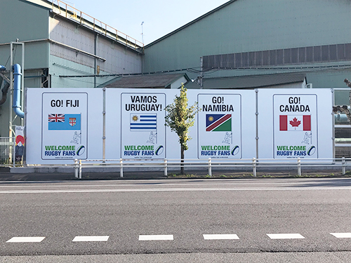 昨年12月に釜石製鉄所構内に設置されたライトウインドが、釜石市が実施しているラグビーワールドカップに向けたシティドレッシングに協力する形で、高さ4メートル・全長16メートルの応援パネルとして生まれ変わり、大会の雰囲気を盛り上げています。