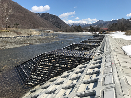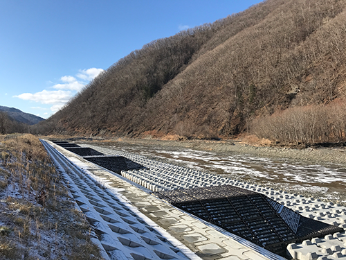 河川洪水時における流水方向の規制・流速の緩和により、堤防の越水浸食防止を目的に設置される「水制工」を、