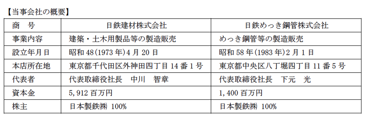 日本製鉄株式会社の完全子会社である日鉄建材株式会社と日鉄めっき鋼管株式会社は、両社の競争力強化を目的に、本年10月1日に日鉄めっき鋼管株式会社を日鉄建材株式会社の完全子会社とすることで合意しましたので、お知らせいたします。