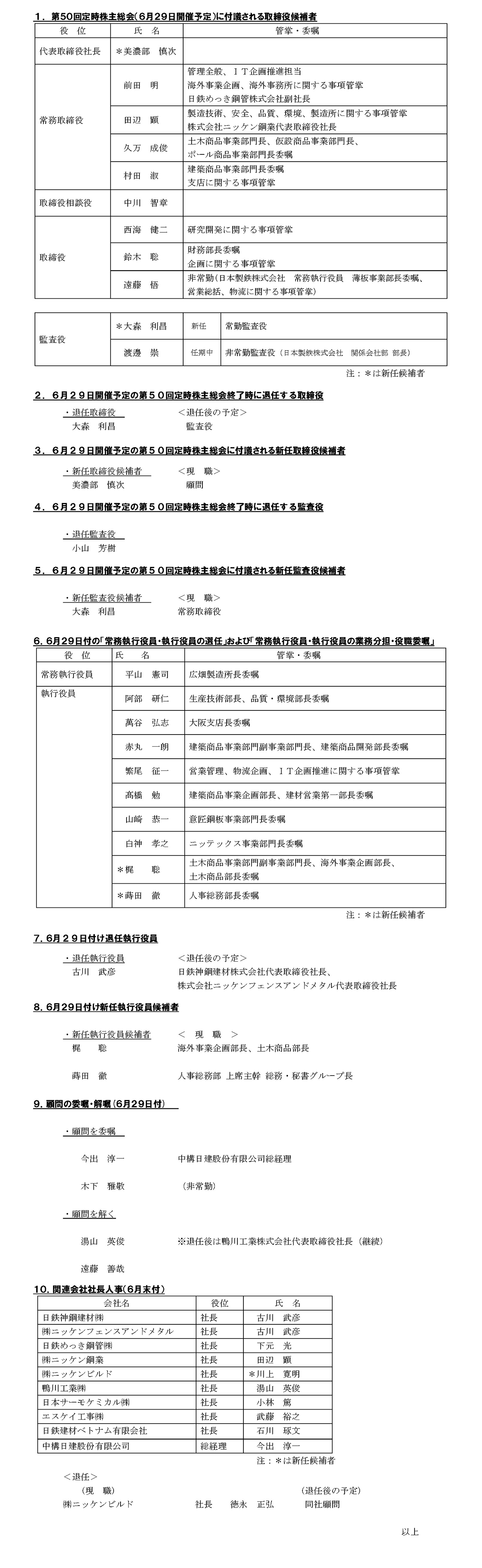 本日開催の取締役会において、第50回定時株主総会(2023年6月29日開催予定)に付議される「取締役候補者」および「監査役候補者」、ならびに同株主総会終了後開催の第520回取締役会にて正式決定される「代表取締役の選任」、「役付取締役の選任」および「取締役の管掌・委嘱事項」について内定いたしましたのでお知らせいたします。