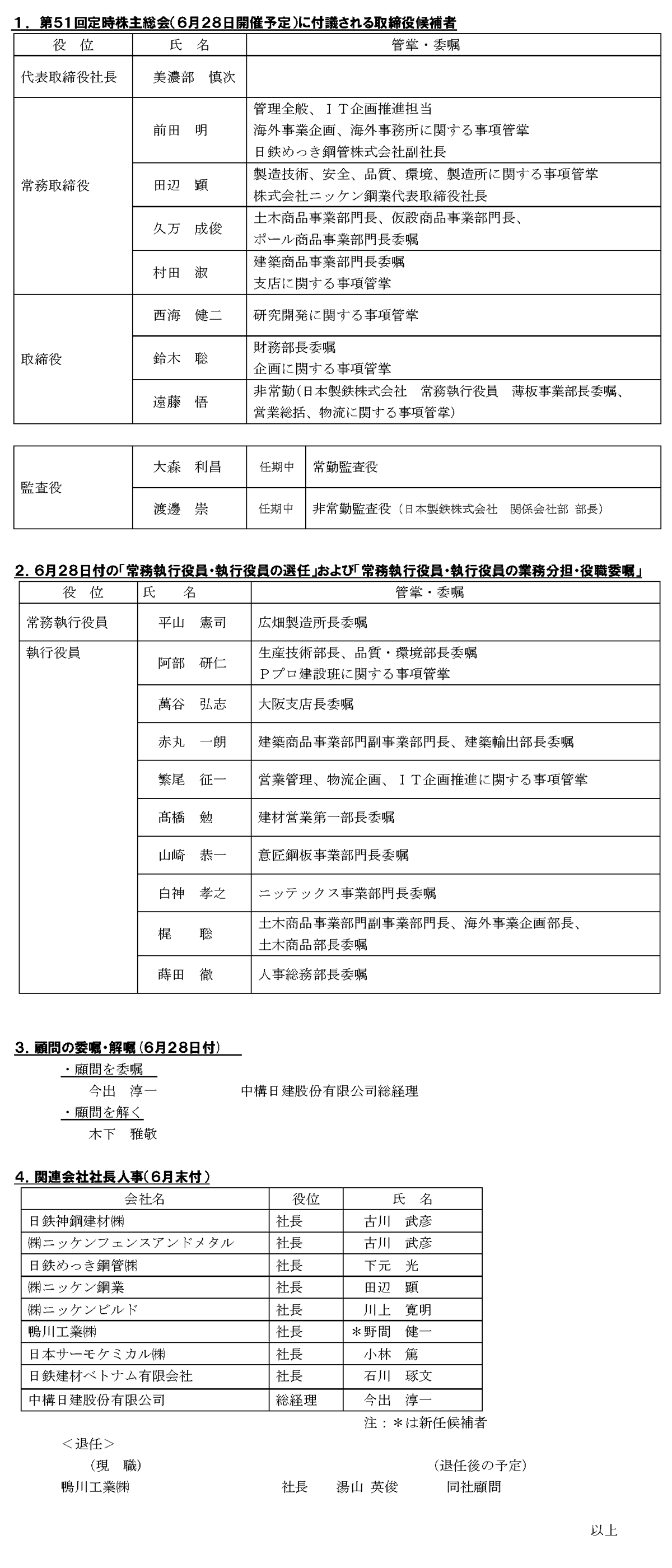 本日開催の取締役会において、第51回定時株主総会(2024年6月28日開催予定)に付議される「取締役候補者」および「監査役候補者」、ならびに同株主総会終了後開催の第531回取締役会にて正式決定される「代表取締役の選任」、「役付取締役の選任」および「取締役の管掌・委嘱事項」について内定いたしましたのでお知らせいたします。