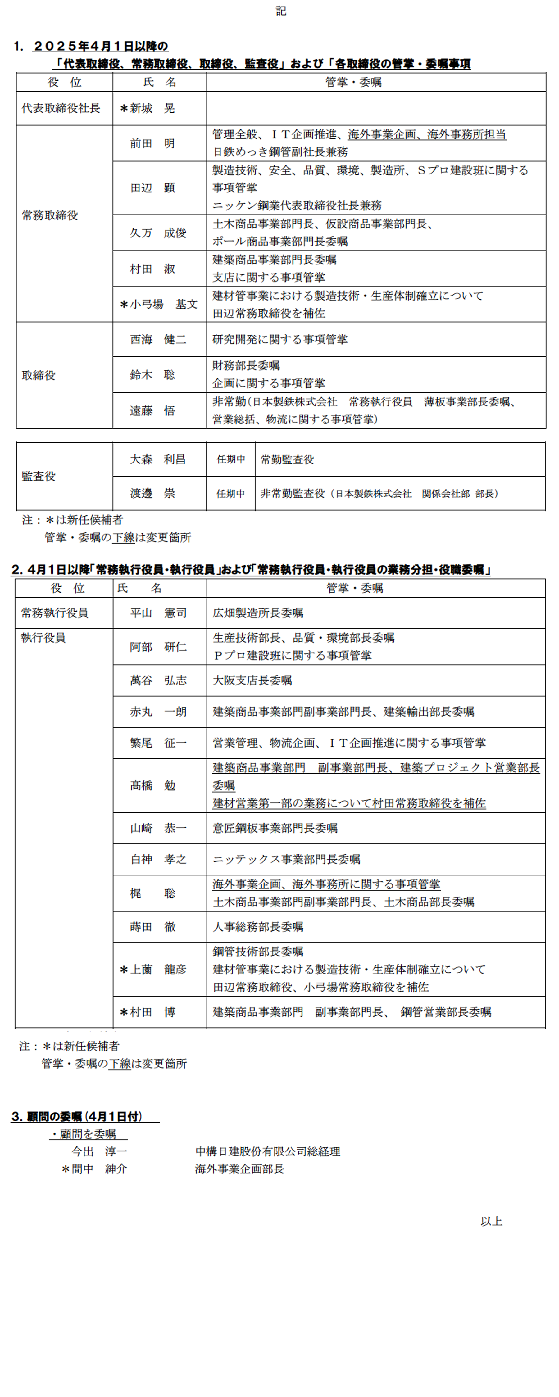 本日開催の取締役会において、2025年4月1日以降の役員体制が下記のとおり内定いたしましたのでお知らせいたします。 なお、「取締役候補者」、「代表取締役選任」、「役付取締役の選任」および「取締役の管掌・委嘱事項」については、臨時株主総会(2025年 3 月 37 日開催予定)ならびに第542回取締役会 (2025年4月1日開催予定にて正式決定されます。