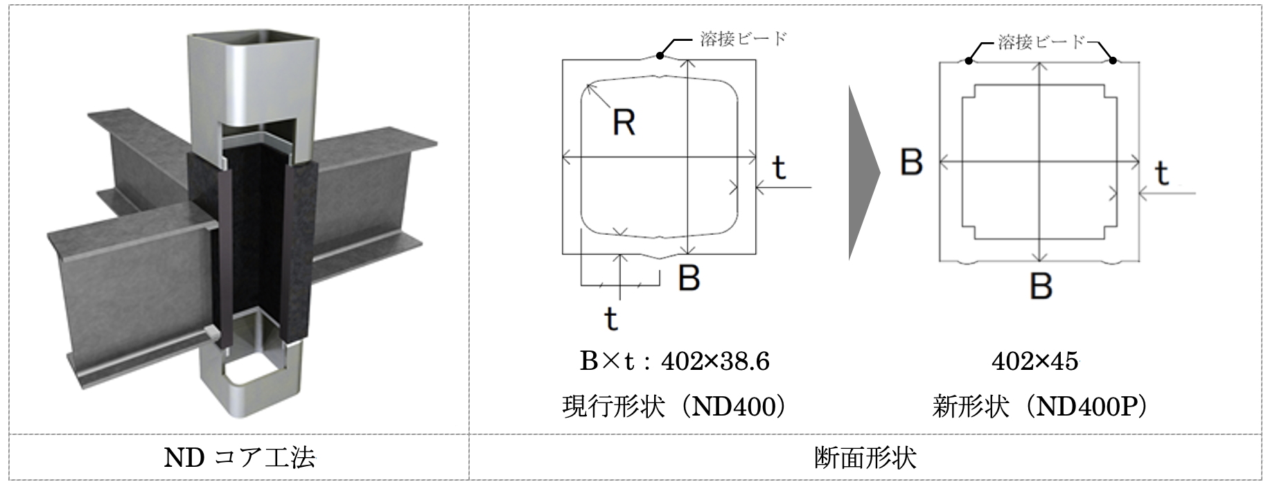 ND400タイプの形状変更および適用範囲拡大のお知らせ 日鉄建材株式会社(代表取締役社長:新城晃)(以下、日鉄建材)は、柱はりノンダイアフラム接合部材『NDコア』のうち、柱サイズ□400mm用の「ND400」について、製造方法および使用材料を変更し、490N級のはりまで適用範囲を拡大します。 NDコアは、熱間成形された山形鋼やみぞ形鋼を組み合わせて構成した厚肉角形鋼管によるノンダイアフラム形式の柱はり接合部材で、鉄骨はりの取り付け位置に必要となる通しダイアフラムや内ダイアフラムを使用することなく鉄骨はりを直接接合することが可能です。これにより溶接箇所は従来工法の1/2~1/3程度に削減可能で、鉄骨加工の中で最も手間を要する柱はり接合部の加工工数を大幅に軽減することができ、同時に溶接部の検査数も削減できることが特長です。