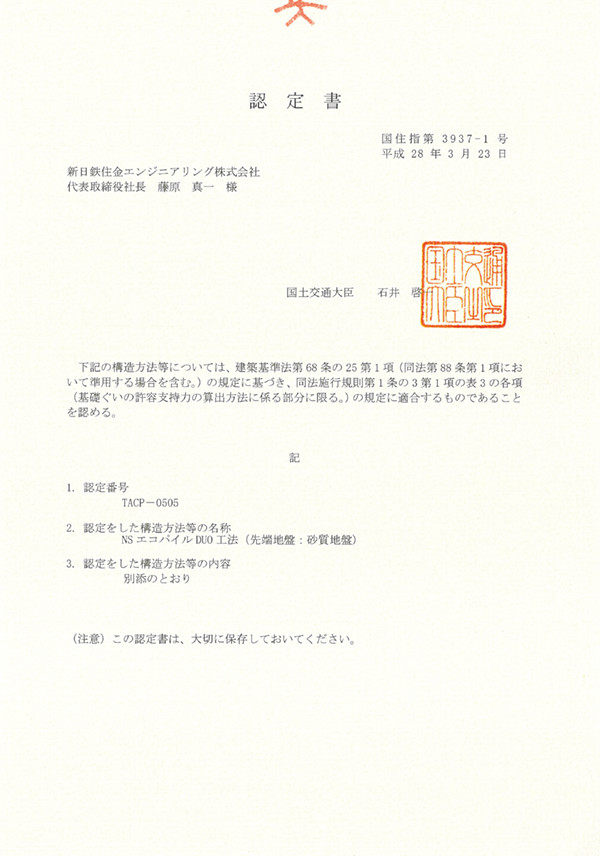 本工法の許容支持力について、建築基準法第68条の25第1項に基づく国土交通大臣認定を取得しています。