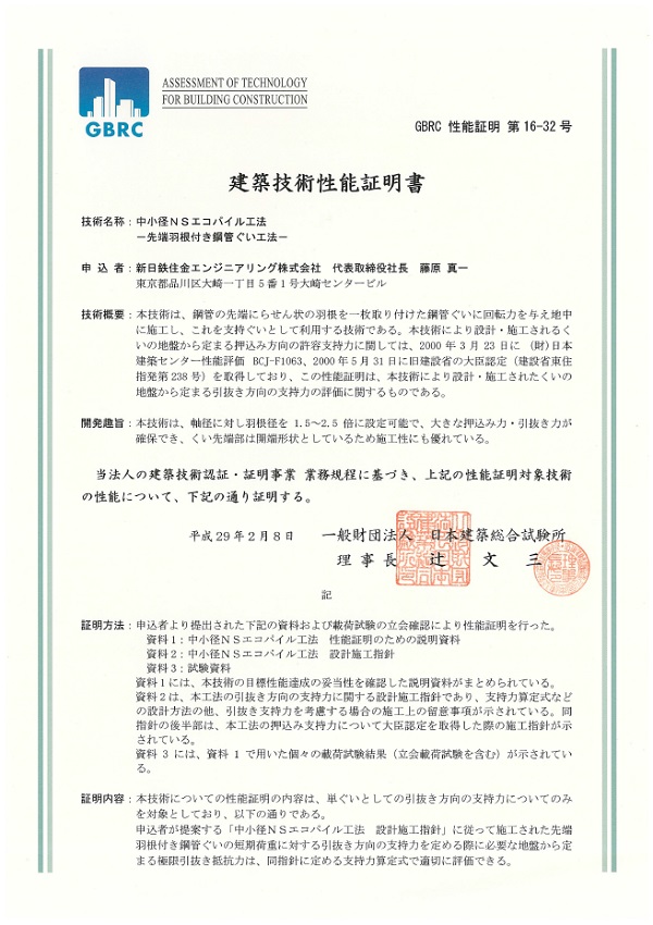 中小径NSエコパイルの引抜き方向の許容支持力については(一財)日本建築総合試験所の評定を取得しております。