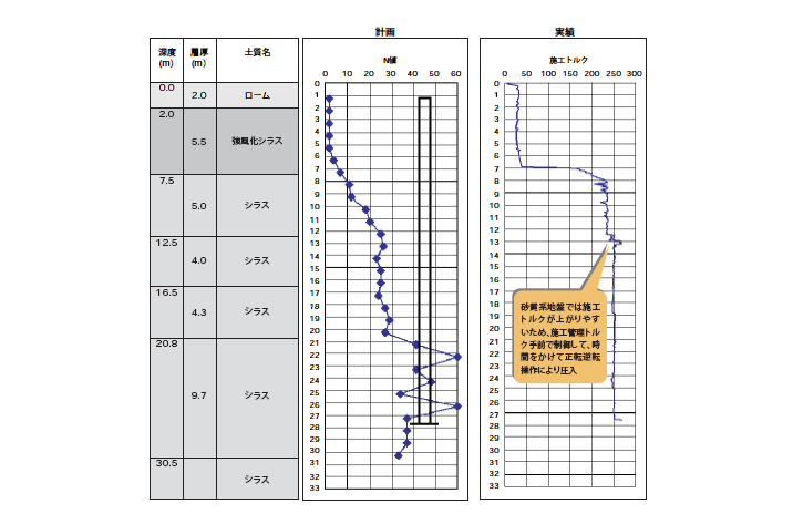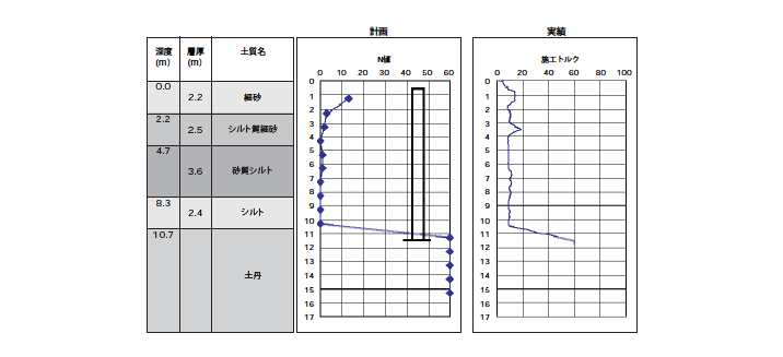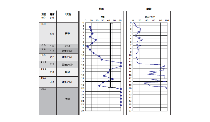 羽根の中央に穴が開いており、羽根の下に突起物も無いので地盤の硬さが急変しても滑らずに貫入。さらにそのまま中間層を打ち抜くこともできます。また、砂や礫層以外の地盤についても、数多くの実績があります。